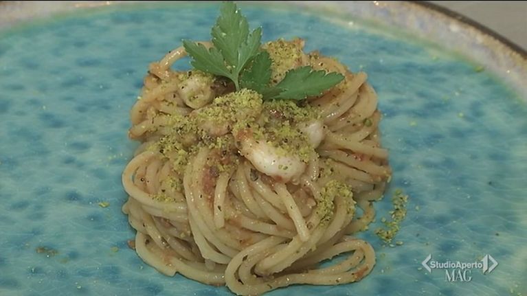 Una ricetta con il gusto, il colore e il sapore della Sicilia: spaghetti di grani antichi con pesto di pomodorini secchi, gamberetti e pistacchio.