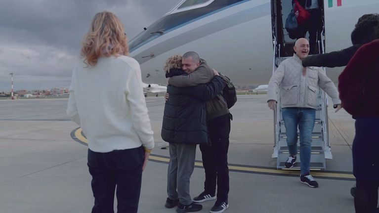 Il lungo e commosso abbraccio con i familiari appena atterrati a Ciampino. I due sono stati liberati dopo più di un anno di detenzione a Caracas.