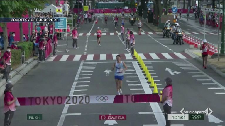 Massimo Stano taglia per primo il traguardo della 20km di marcia.