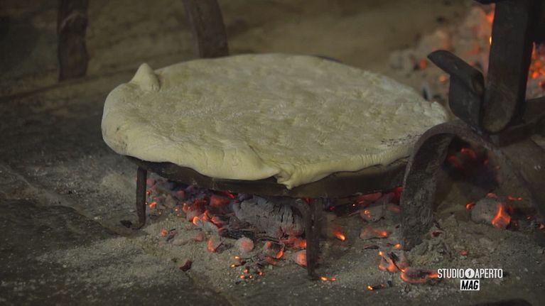 Una focaccia cotta su particolari teglie di pietra.