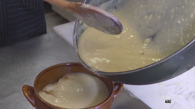 La zuppa dell'abate del bandito Ghino di Tacco: una ricetta a base di fave secche accompagnata dal un bicchiere di Vernaccia.