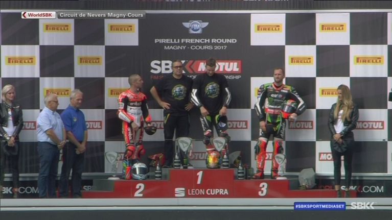 Il podio di Gara 1 a Magny-Cours, con Rea-Melandri-Sykes