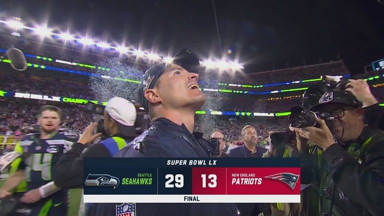 Coach Mike Macdonald viene completamente inondato di Gatorade dai suoi giocatori alla fine del Super Bowl 2026.