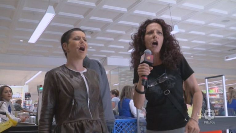Diversi clienti del supermercato cantano questa canzone insieme a noi