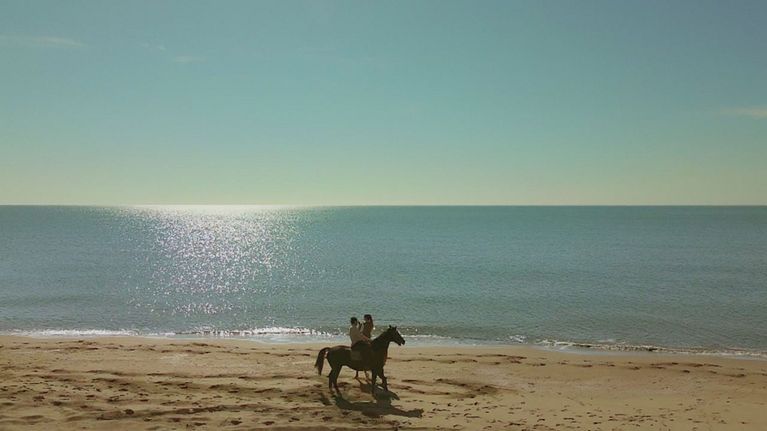 Hakan e Zuleyha cavalcano insieme sulla spiaggia.
