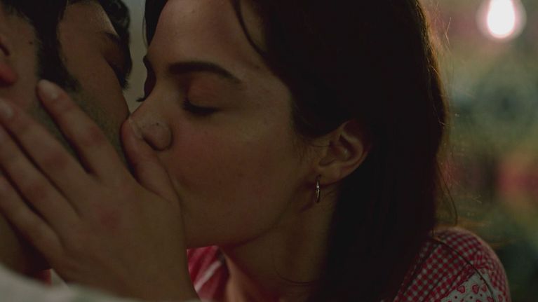 I due giovani innamorati, in un momento intimo e nascosto, si dichiarano il loro amore e si scambiano tenerezze.