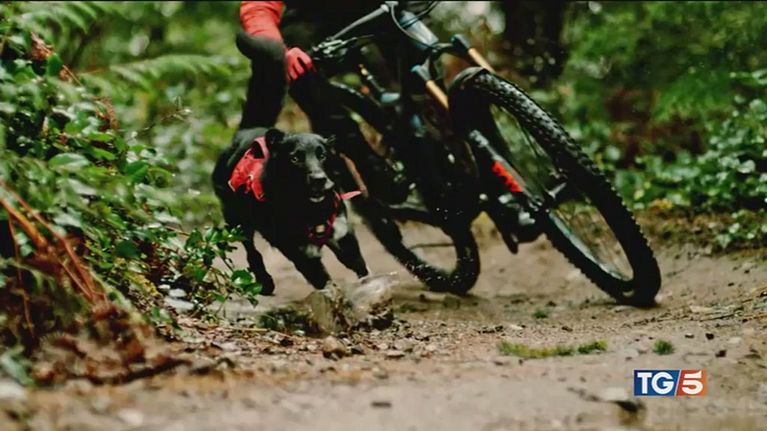 Atleti in mountain bike con accanto i loro amici a quattro zampe.
