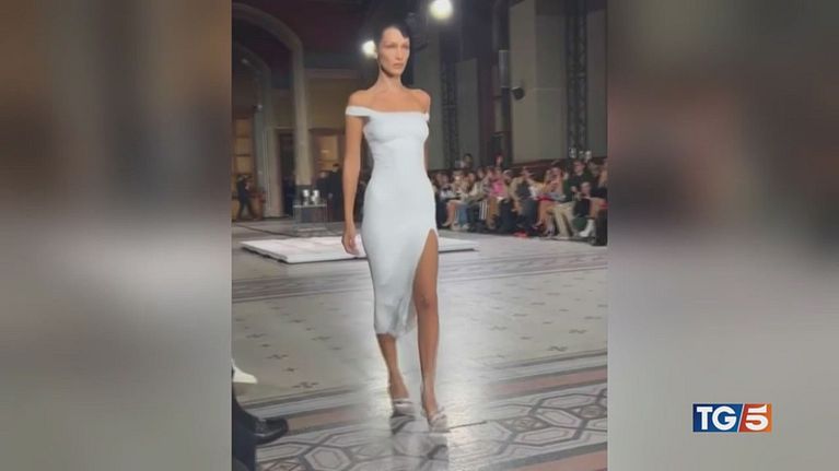 Parigi, magia in passerella: Bella Hadid sfila con l'abito spray spruzzato sul corpo.