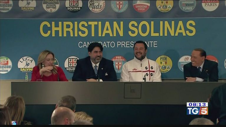 Meloni, Salvini e Berlusconi in una conferenza stampa a Cagliari a due giorni dalle regionali.