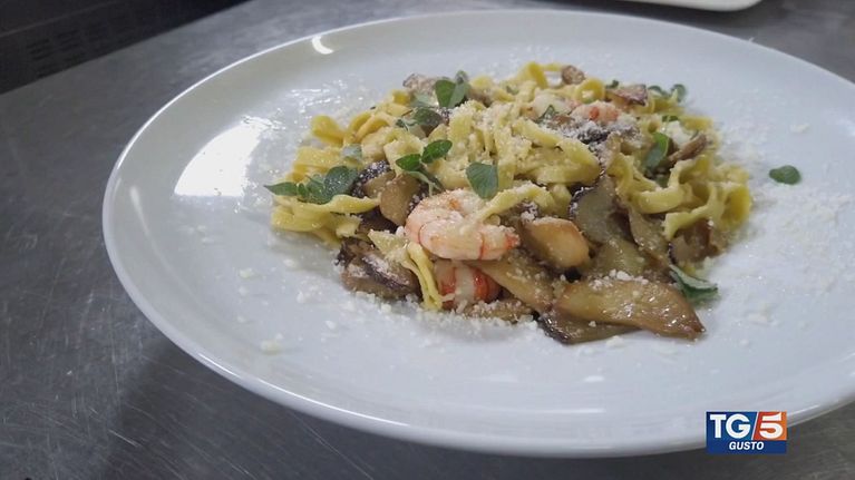 Gusto: tagliatelle con funghi porcini, gamberoni e pecorino