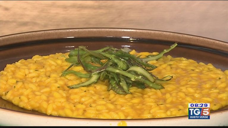 Siamo in Sicilia per assaggiare un risotto con carota, limone, rosmarino e asparago crudo.