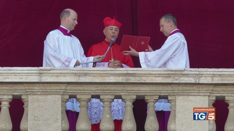 Il cardinale protodiacono Dominique Mamberti raggiunge la Loggia delle Benedizioni e annuncia al mondo l'avvenuta elezione e il nome del nuovo Pontefice: Robert Francis Prevost che si chiamerà Leone XIV.