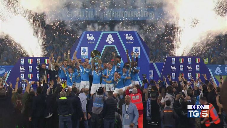 Napoli in festa per il quarto scudetto. Gli azzurri battono al Maradona per 2-0 il Cagliari e vincono il campionato di calcio, scatenando la gioia della tifoseria partenopea
