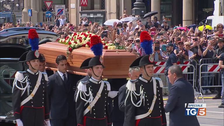Il feretro di Silvio Berlusconi arriva in Piazza Duomo a Milano, teatro dei funerali del Presidente.