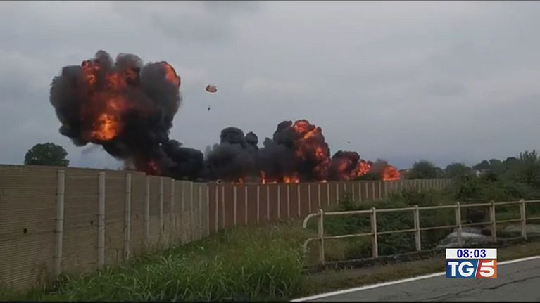Un aereo delle Frecce tricolori si schianta dopo il decollo all'aeroporto di Caselle a Torino, un frammento colpisce un auto e uccide una bambina