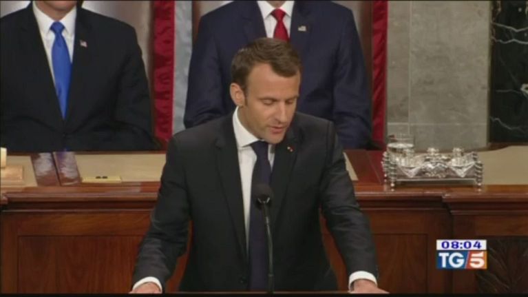 Il Presidente francese negli Usa, discorso agli antipodi con le politiche del tycoon.