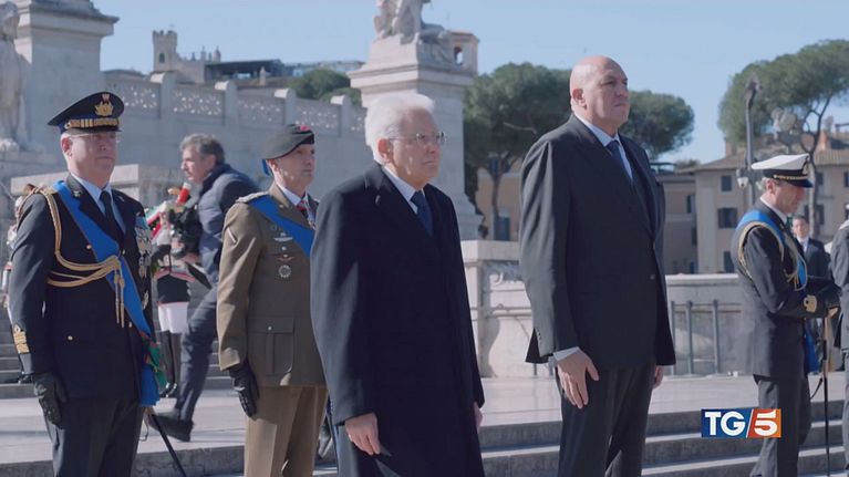 Il capo dello Stato Sergio Mattarella e le più alte cariche di dello Stato all'Altare della Patria per la giornata dell'unità nazionale.