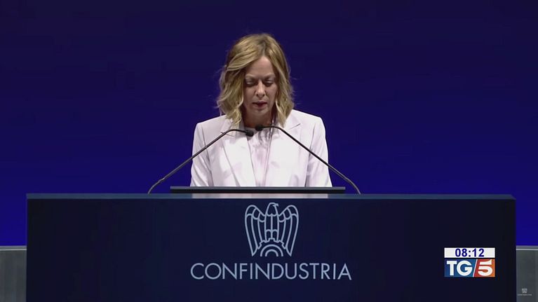 La premier a Confindustria, intesa con il presidente Orsini. Draghi a Palazzo Chigi.