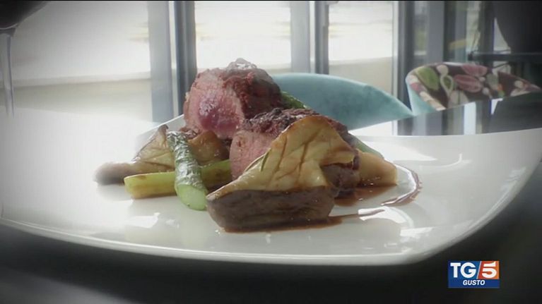 Ricetta con polvere di pomodoro, agnello laziale, asparagi e cardoncelli