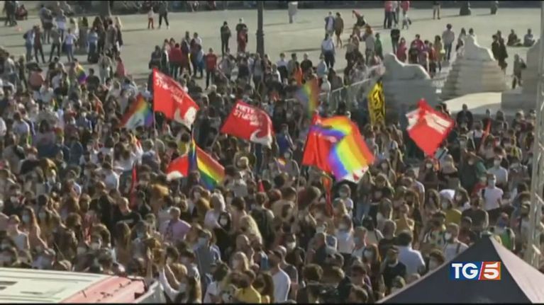 In piazza del popolo a Roma manifestazione a favore del ddl Zan. Manifestazione opposta a piazza duomo a Milano.