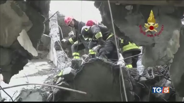 A Genova sospesi per il maltempo i lavori sul moncone pericolante del ponte crollato.