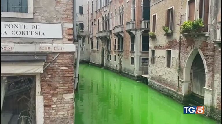 L'acqua nel Canal Grande diventa verde fluorescente per lo sversamento di un liquido ancora ignoto