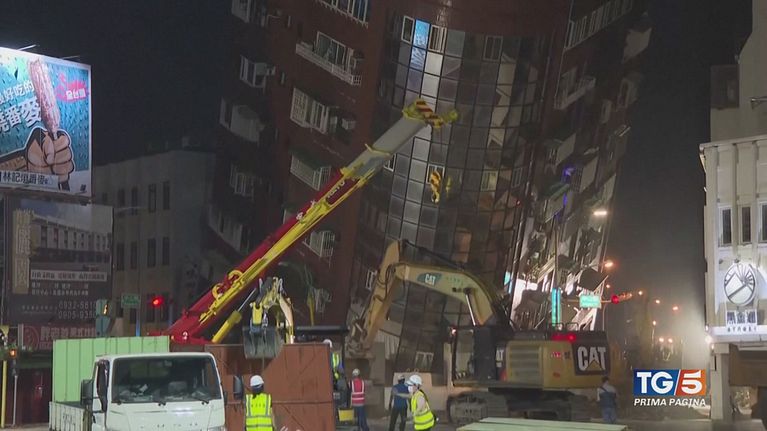 A Taiwan si scava tra macerie e palazzi dopo il sisma di magnitudo 7.4.