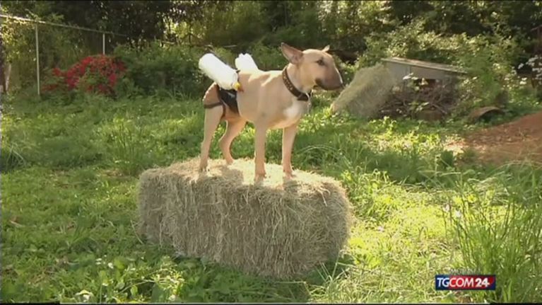 Bull terrier allatta due caprette