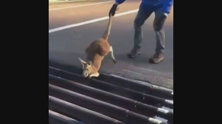 Canguro curioso rimane incastrato in una griglia stradale