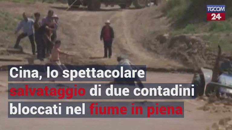 Cina, lo spettacolare salvataggio di due contadini rimasti bloccati nel fiume in piena