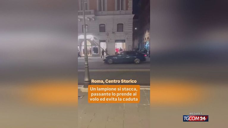 Crolla lampione a Roma, un passante lo sorregge