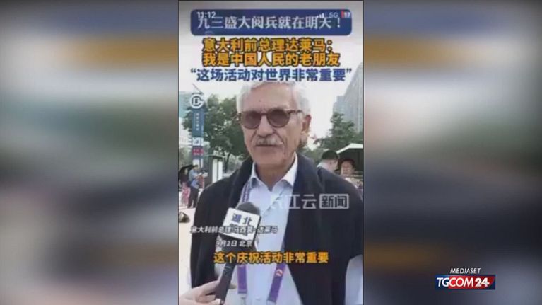 L'ex premier partecipa alla parata militare per l'80° anniversario della fine della Seconda guerra mondiale. Le sue parole sul valore della pace scatenano critiche nella politica italiana