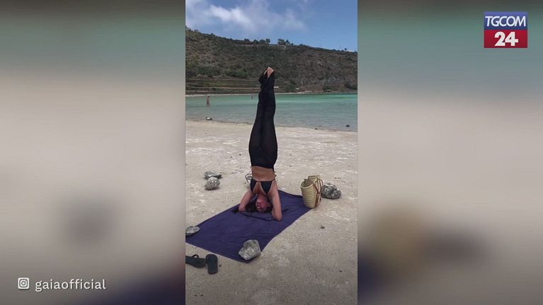 Gaia, che acrobazie in spiaggia: la cantante è a testa in giù