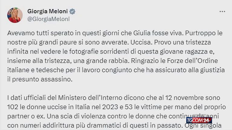 Sul femminicidio di Giulia Cecchettin e sulla violenza di genere maggioranza e opposizione sono d'accordo. "Ogni singola donna uccisa perché colpevole di essere libera è un'intollerabile aberrazione. Una barbarie da fermare", ribadisce il premier Meloni sui social, ricordando che mercoledì in Senato verrà definitivamente approvato il disegno di legge per il rafforzamento delle misure del codice rosso. Sul caso interviene anche Elly Schlein.