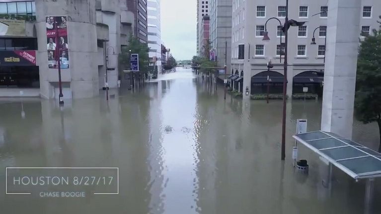 Un drone sorvola la metropoli dopo il terribile passaggio dell'uragano Harvey
