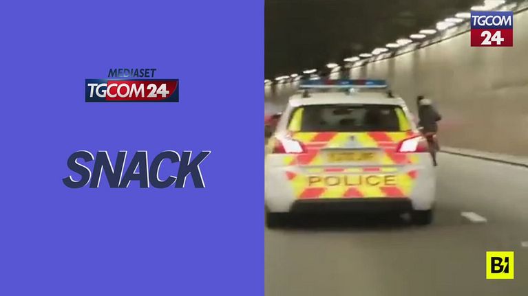 Un motociclista si lancia in acrobazie in sella mentre affianca l'auto dei poliziotti lungo una strada di Leeds, in Gran Bretagna