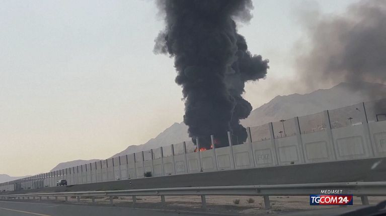 Dense colonne di fumo si sono levate verso il cielo a Fujairah