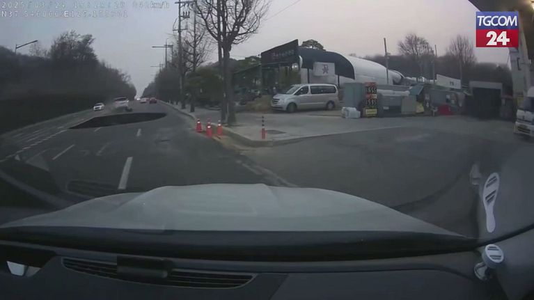 Seul, il momento in cui una voragine si apre nella strada e inghiotte un motociclista