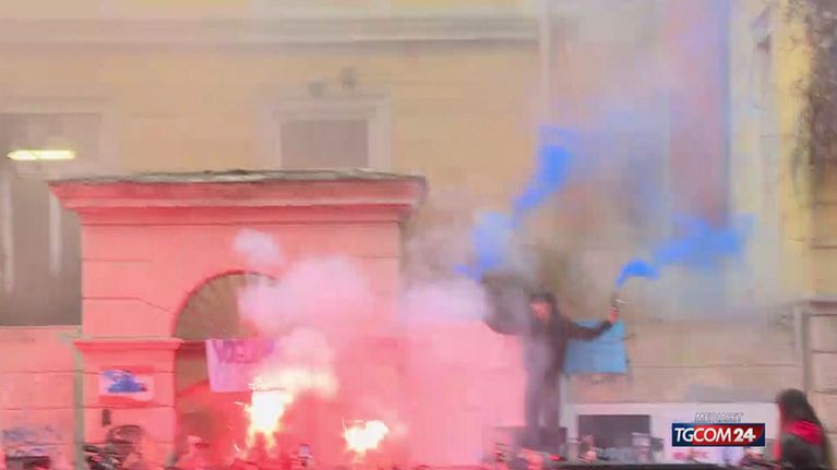 Centinaia di ragazzi si sono piazzati all'ingresso con fumogeni e cartelloni che accusano l'istituto