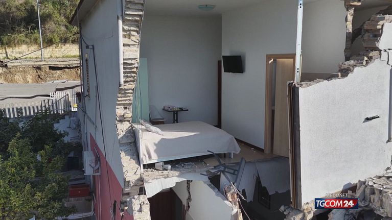 Le immagini dal drone mostrano una scena impressionante: una casa completamente aperta in due dopo la frana e la camera da letto sospesa nel vuoto