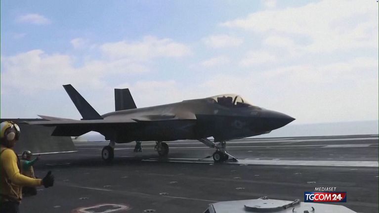 Nelle immagini si vedono caccia"decollare da una portaerei e bombe e missili distruggere attrezzature militari iraniane