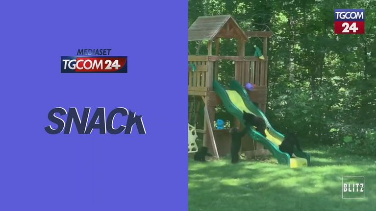 Un'allegra famigliola di orsi si diverte tra scivoli e altalene nel cortile di una casa privata, in North Carolina.
