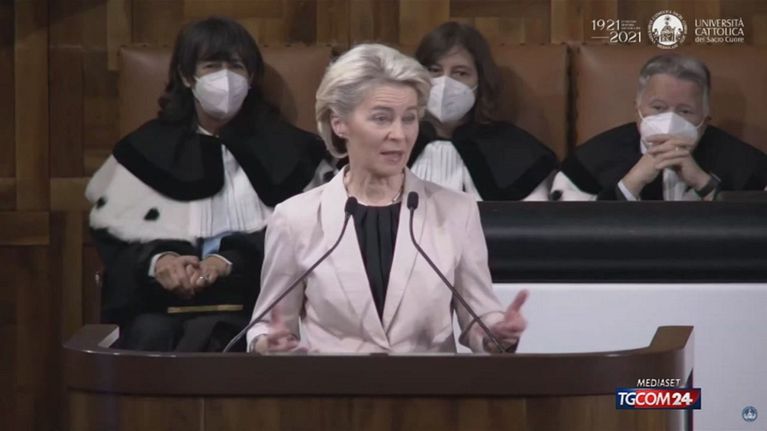 "Grazie alla solidarietà"europea e"alla capacità"dell'Italia di gestire efficacemente la pandemia,"l'economia italiana"sta crescendo più"in fretta che in qualunque"altro momento dall'inizio di questo secolo". Lo ha detto la"presidente della Commissione Europea,"Ursula von der Leyen, nel suo intervento"in occasione del centesimo"anniversario dell'Università"Cattolica di Milano che inaugura"l'anno accademico 2021-2022.
