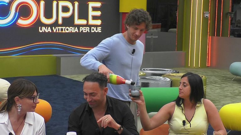 Fabrizio Mileto porta nella Casa delle Coppie delle bottiglie Puntocuore per coronare la serata della pizza