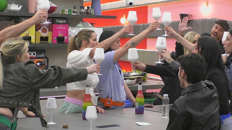 Le squadre brindano con una bottiglia di Puntocuore, riappacificandosi dopo le Nomination appena assegnate in seguito alla sfida