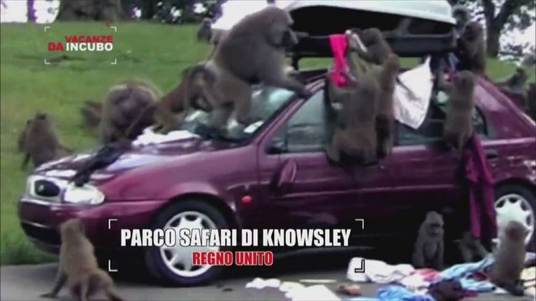 In un parco safari in Inghilterra i babbuini saccheggiano le auto parcheggiate.