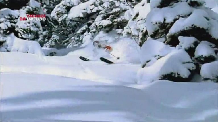 Uno sci rimane impigliato in una roccia e finisce a testa in giù lungo il pendio.