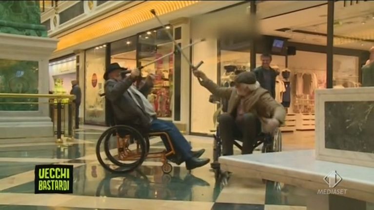 Due vecchietti disabili usano i loro bastoni per duellare davanti a passanti divertiti.