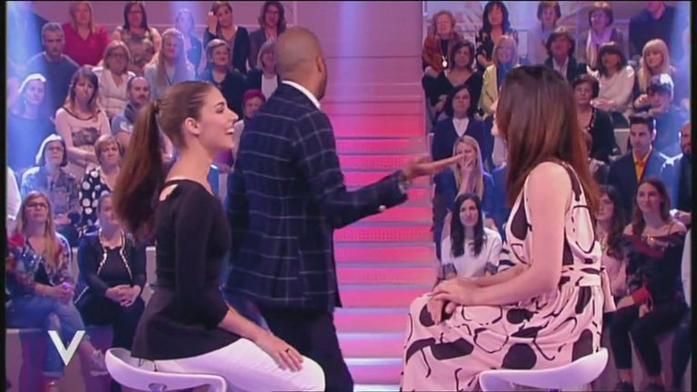 Aida Flix si diverte a rispondere alle domande del presentatore, che non può fare a meno di farle dei complimenti.