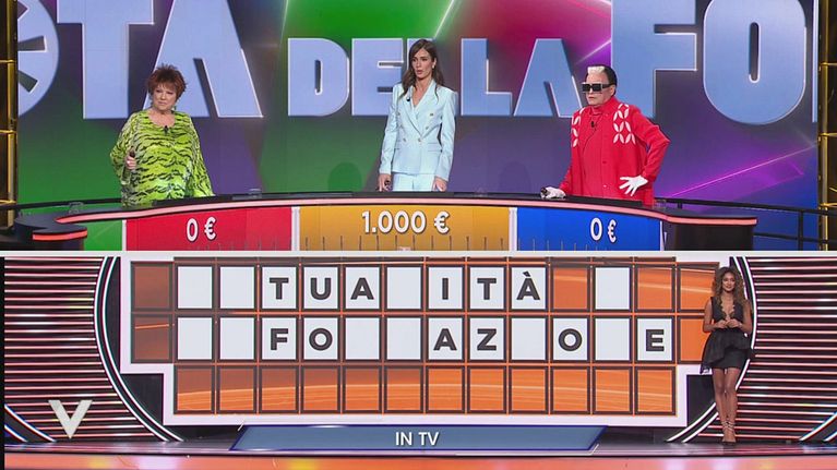 Silvia Toffanin, Orietta Berti e Cristiano Malgioglio si sfidano alla seconda manche de "La Ruota della Fortuna" a tema televisione.